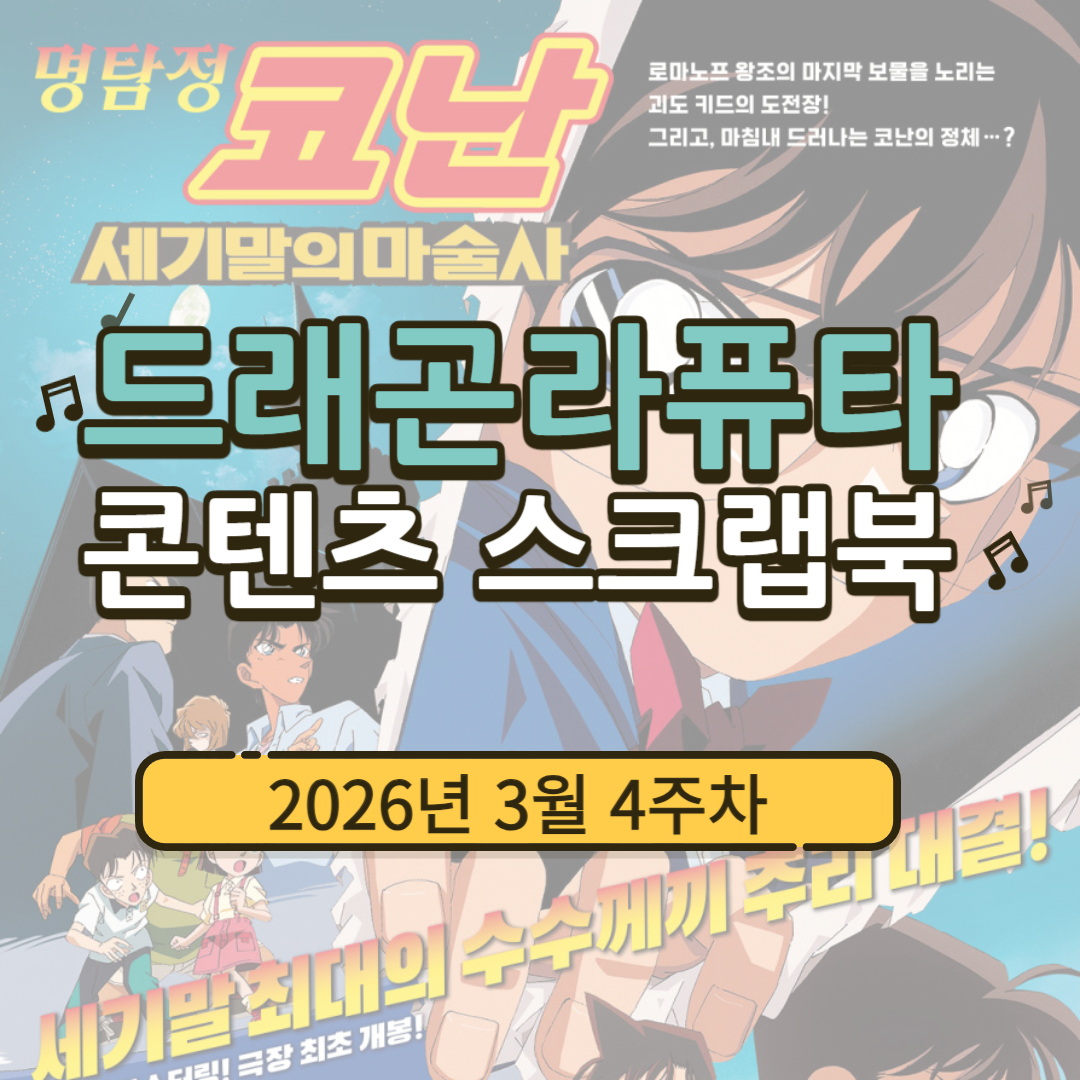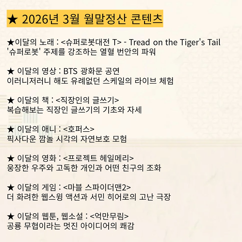 ◆ 2026년 3월 월말정산 콘텐츠- 한달을 돌아보는 '먼슬리뷰' 방식으로 한달 중에 가장 인상깊었던 콘텐츠들을 정리.★이달의 노래 : OST - '슈퍼로봇' 주제를 강조하는 열혈 번안의 파워★ 이달의 영상 : BTS 광화문 공연이러니저러니 해도 유례없던 스케일의 라이브 체험★ 이달의 책 : 복습해보는 직장인 글쓰기의 기초와 자세★ 이달의 애니 : 픽사다운 깜놀 시각의 자연보호 모험★ 이달의 영화 : 웅장한 우주와 고독한 개인과 어떤 친구의 조화★ 이달의 게임 : 더 화려한 웹스윙 액션과 서민 히어로의 고난 극장★ 이달의 웹툰, 웹소설 : 공룡 무협이라는 멋진 아이디어의 쾌감#슈퍼로봇대전T #BTS광화문공연 #직장인의글쓰기 #호퍼스 #프로젝트헤일메리 #마블스파이더맨2 #억만무림#드래곤라퓨타 #콘텐츠 #..